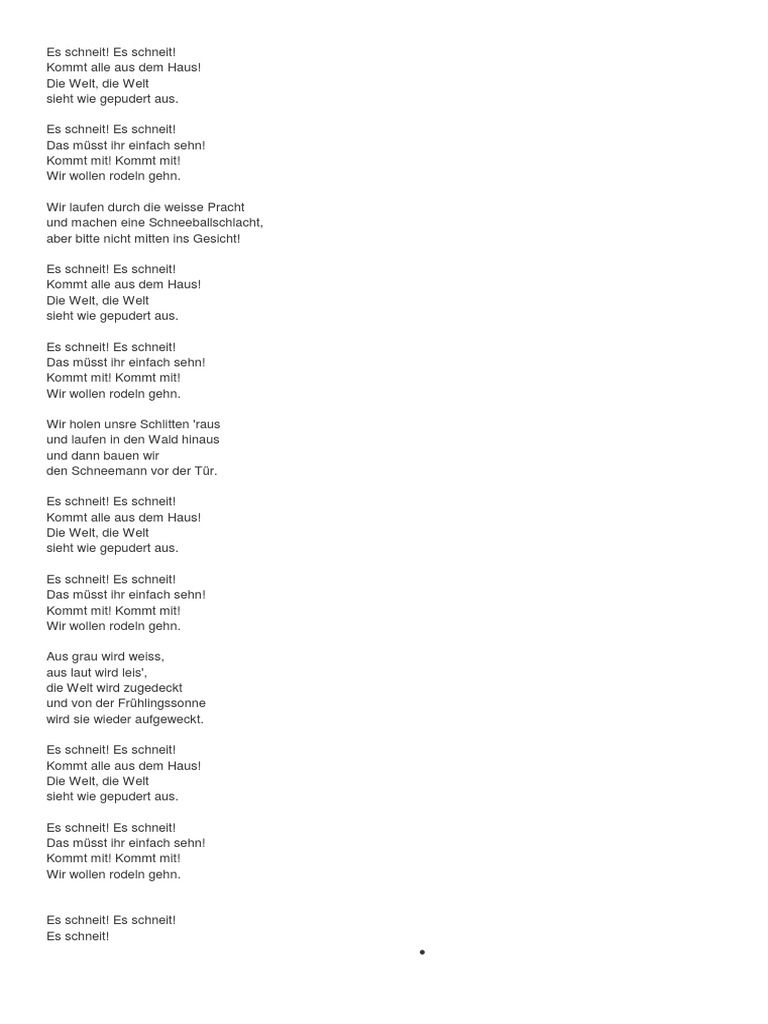 .es schneit kommt alle aus dem haus, die welt, die welt sieht wie gepudert aus, es schneit, es schneit das müsst ihr einfach seh´n kommt mit ver todas as músicas de rolf zuckowski. Das müßt ihr einfach sehn! Ich habe heute einen artikel gefunden über die ukraine. Bei uns im waldviertel hat es endlich auch geschneit: Obwohl ich nicht musik unterrichte, singe ich sehr viel mit den kindern. Aber ich hoffe, der schnee bleibt nicht liegen. Von 18:00h bis 22:00h (die erste, zu der little l. Die setzen sich in meine dichterlocken. Es schneit, es schneit kommt alle aus dem haus die welt, die welt sieht wie gepudert aus es schneit, es schneit das müsst ihr einfach sehen kommt mit, kommt mit wir wollen rodeln gehen. 0 ratings0% found this document useful (0 votes). Sie jagen sich und fliegen, der wind bläst vor vergnügen. Das müsst ihr einfach sehn! Heute war aber nachtübung, d.h.